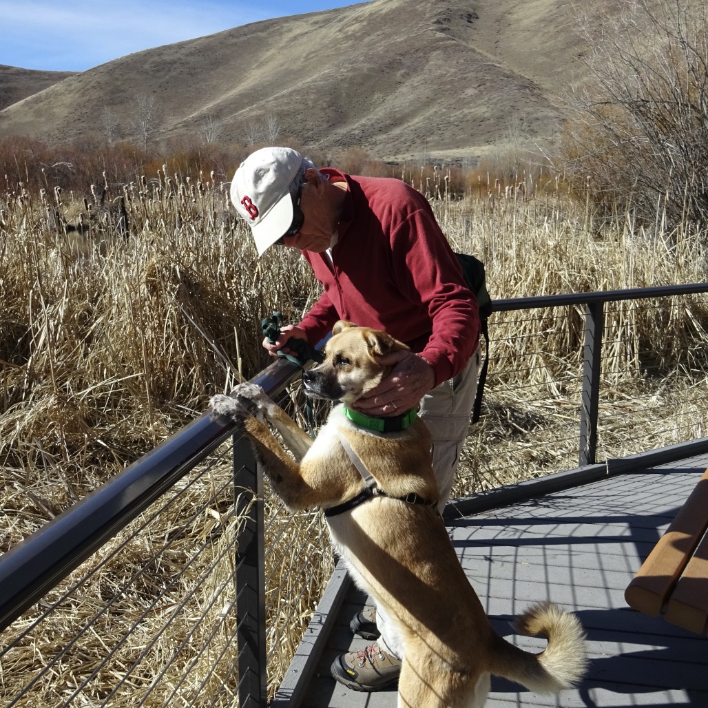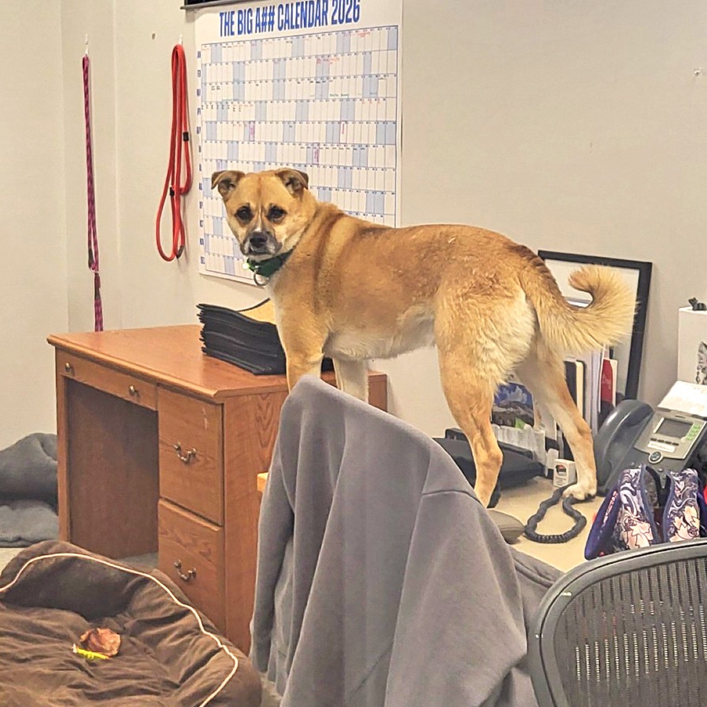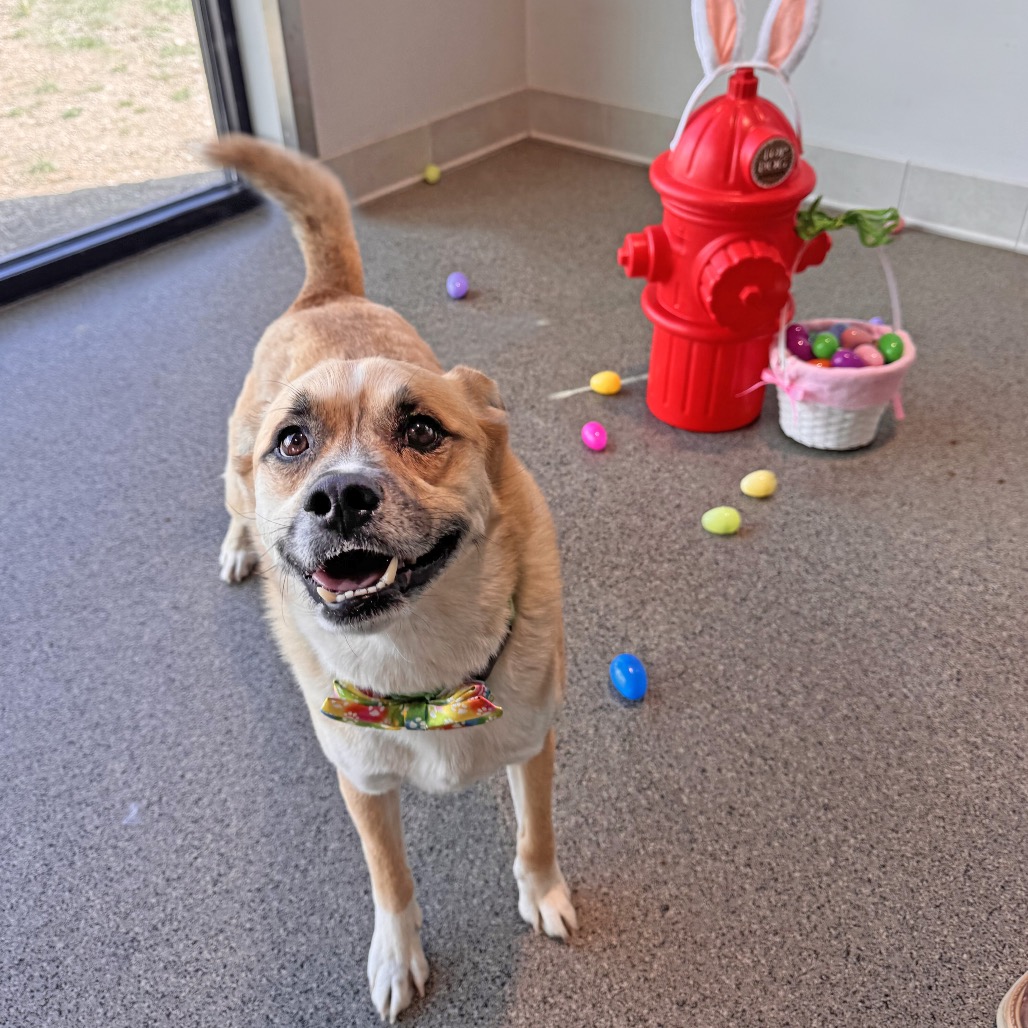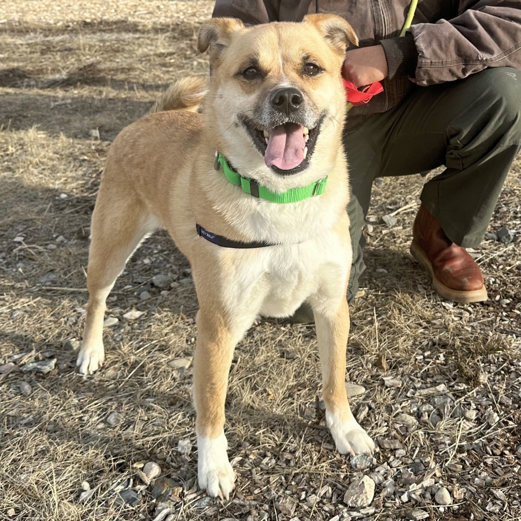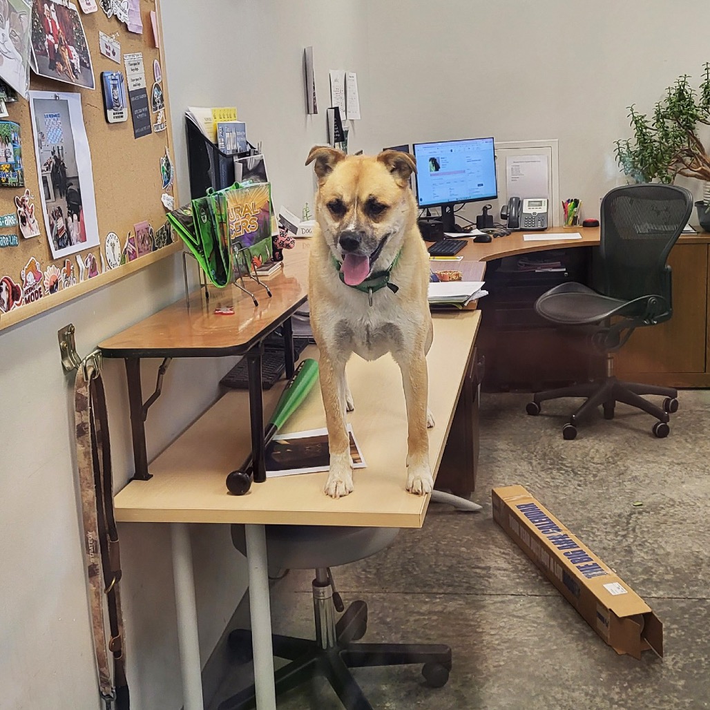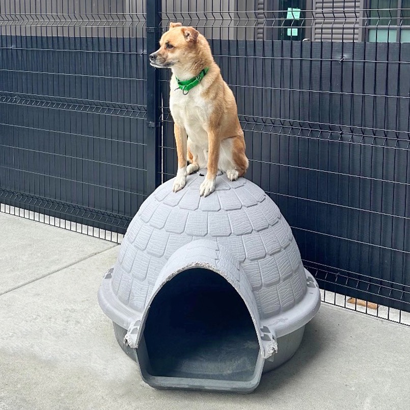 This goofy, agile boy loves a good vantage point—you’ll often find him perched on top of the igloo in the yard or even hopping onto a desk to check things out. With his favorite people, he’s all about affection, leaning in for belly rubs and flashing his signature teefy grin that steals hearts instantly.